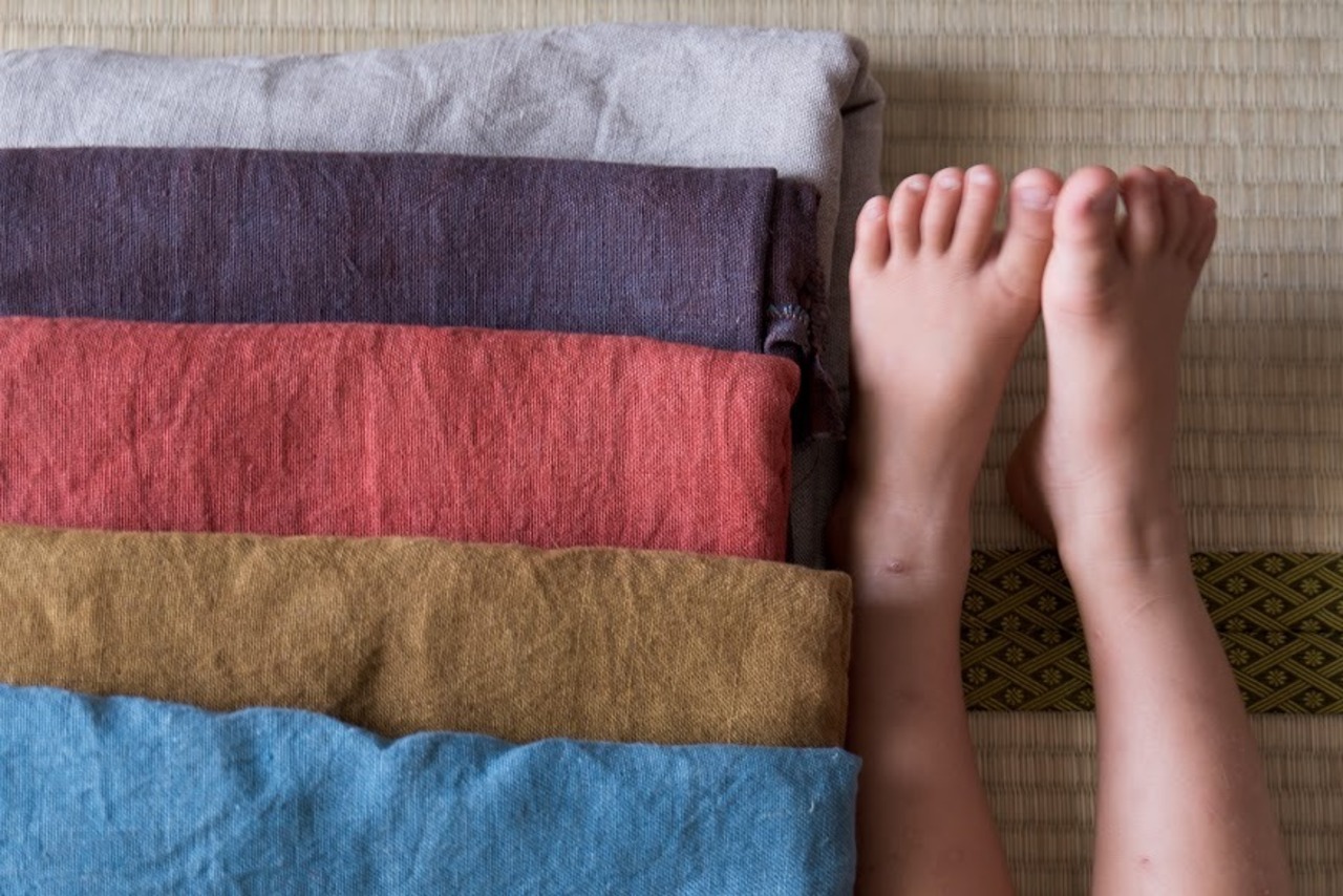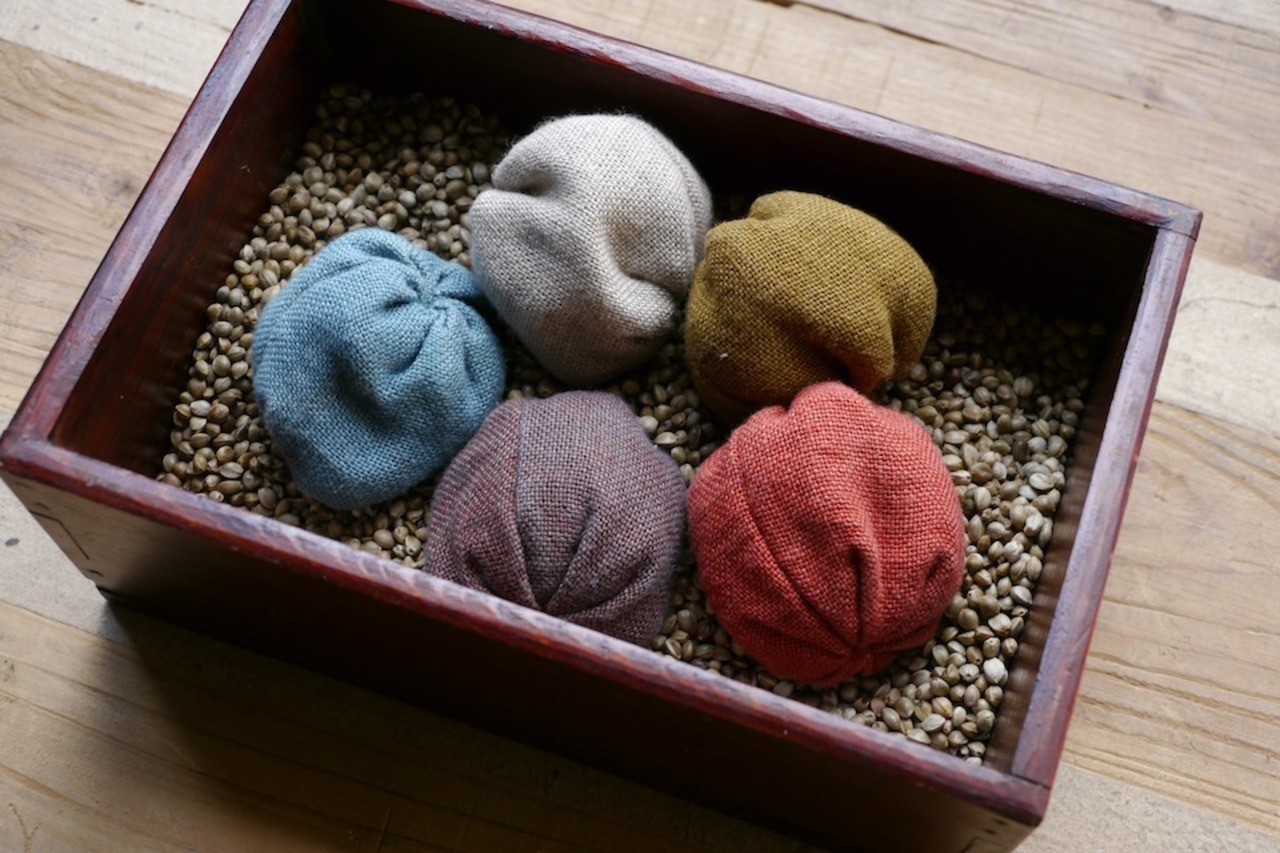 リネン生地を手染め、手縫いで仕上げました。