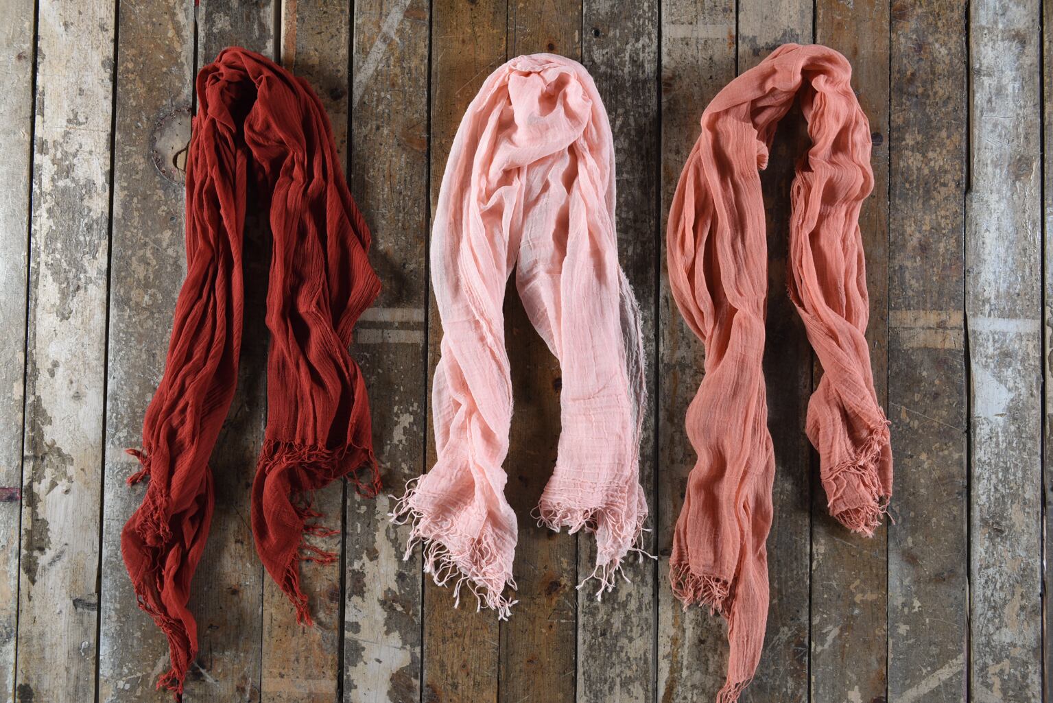 綿の栽培から生産に至るまで、農薬や化学薬品を一切使わず手間ひまかけて作られたガーゼストールを草木で染め重ねました。