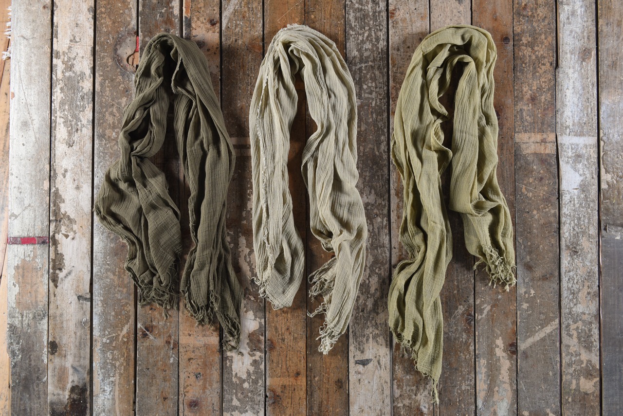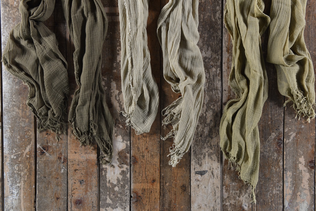 綿の栽培から生産に至るまで、農薬や化学薬品を一切使わず手間ひまかけて作られたガーゼストールを草木で染め重ねました。